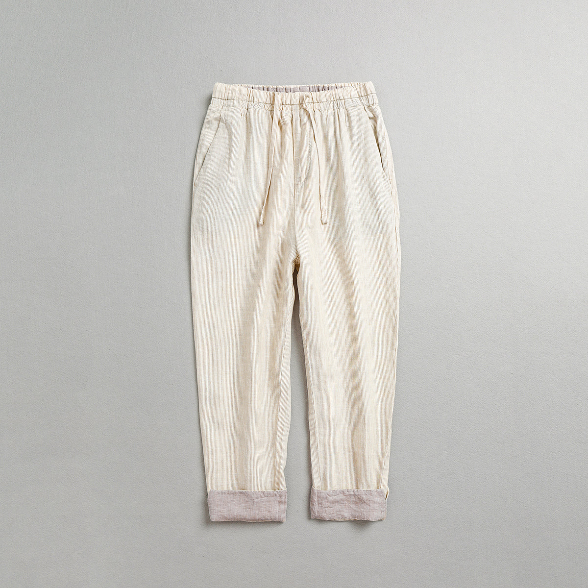 100% Linen Summer Beige Striped Ankle Pants, Men's Elastic Waist Tie Linen Ankle Pants