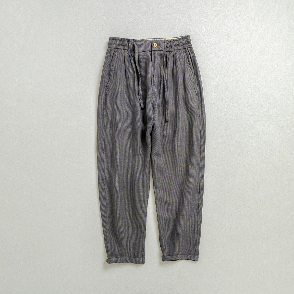 100% Linen Summer Striped Ankle Pants, Men's Elastic Waist Tie Linen Ankle Pants