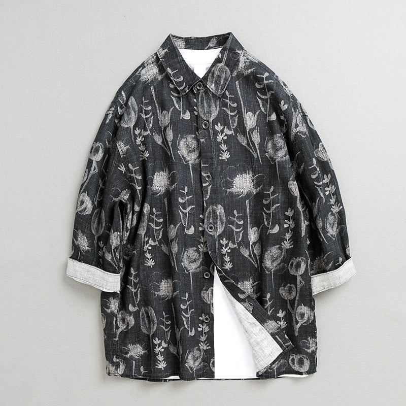 Men's summer half-sleeve printed linen shirt, stand-up collar retro loose casual shirt