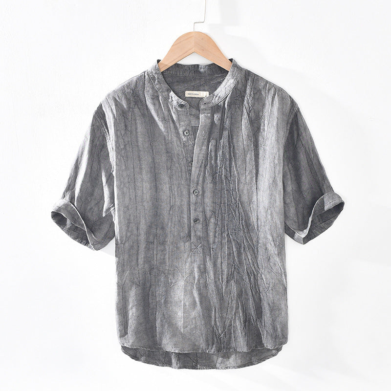 Men's Summer Henley Collar Short Sleeve Linen Shirt, Standing Collar Loose 100% Linen Shirt