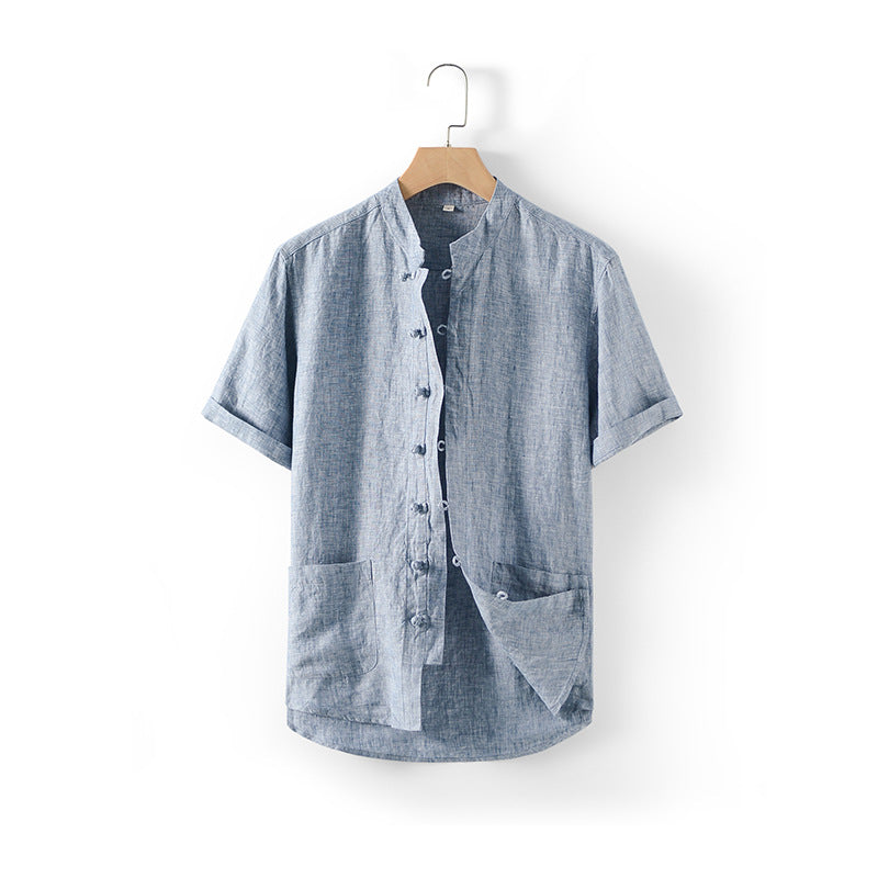 Summer short sleeve linen shirt, vintage stand-up collar frog button 100% linen shirt