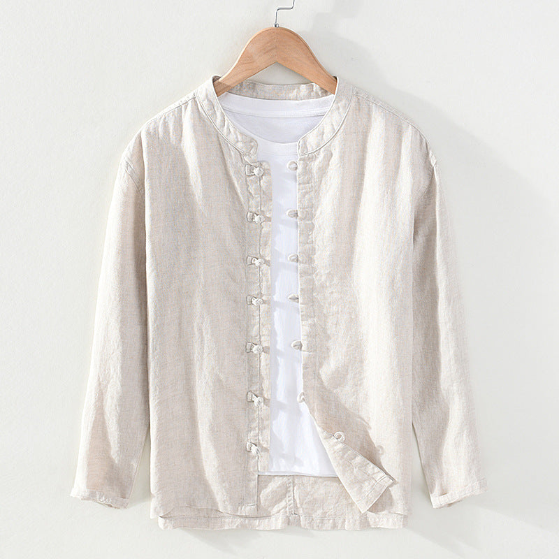 Vintage Chinese frog button linen shirt, men's summer long sleeve linen shirt